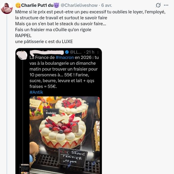 Rapide mise en situation : cet article fait suite à un coup de colère que je me suis pris sur X pendant le week‑end de Pâques. Je réagissais spontanément — oui, c’est mal — à un tweet d’un influenceur à deux balles qui s’offusquait du prix d’une pâtisserie. En gros, le tweet disait : « 55 € le fraisier pour 10 personnes, c’est trop, grave abusé ! Un fraisier, c’est que de la farine, du beurre, des œufs, du lait et quelques fraises. ».